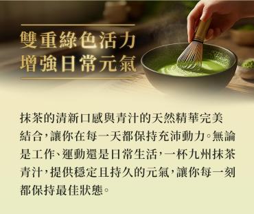 無論是工作、運動還是日常生活,一杯九州抹茶青汁,提供穩定且持久的元氣,讓你每一刻都保持最佳狀態。