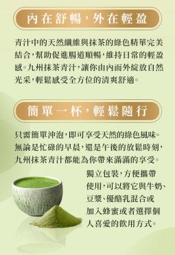 只需簡單沖泡,即可享受天然的綠色風味。無論是忙碌的早晨,還是午後的放鬆時刻,九州抹茶青汁都能為你帶來滿滿的享受。