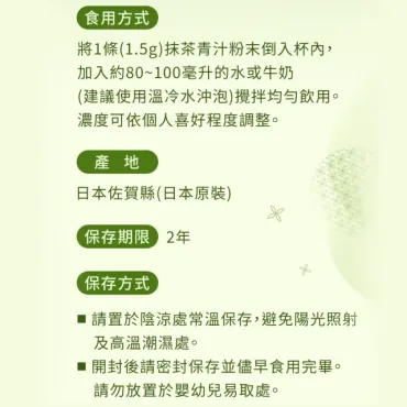 • 成分:大麥苗粉、難消化性麥芽糊精、抹茶粉