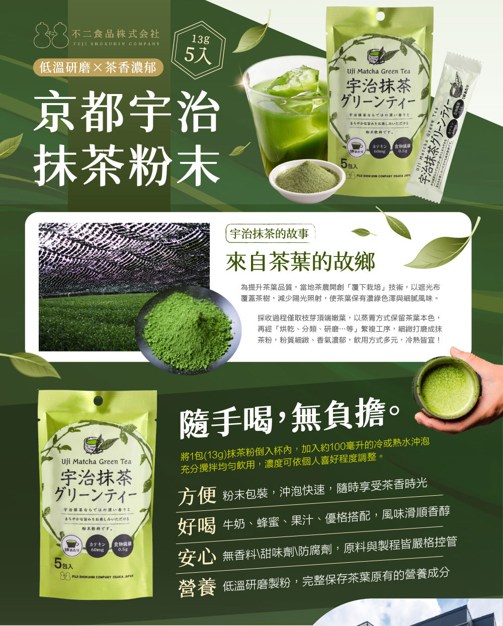 • 商品重(容)量:每日青汁-3g/包、50入/盒;宇治抹茶粉末-13g/包、5包/入