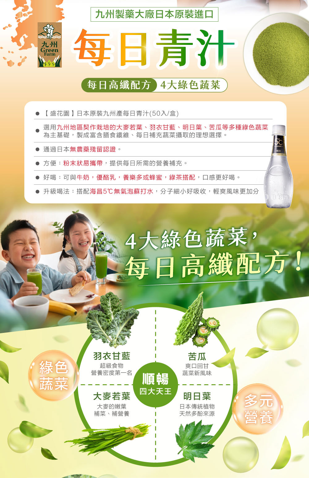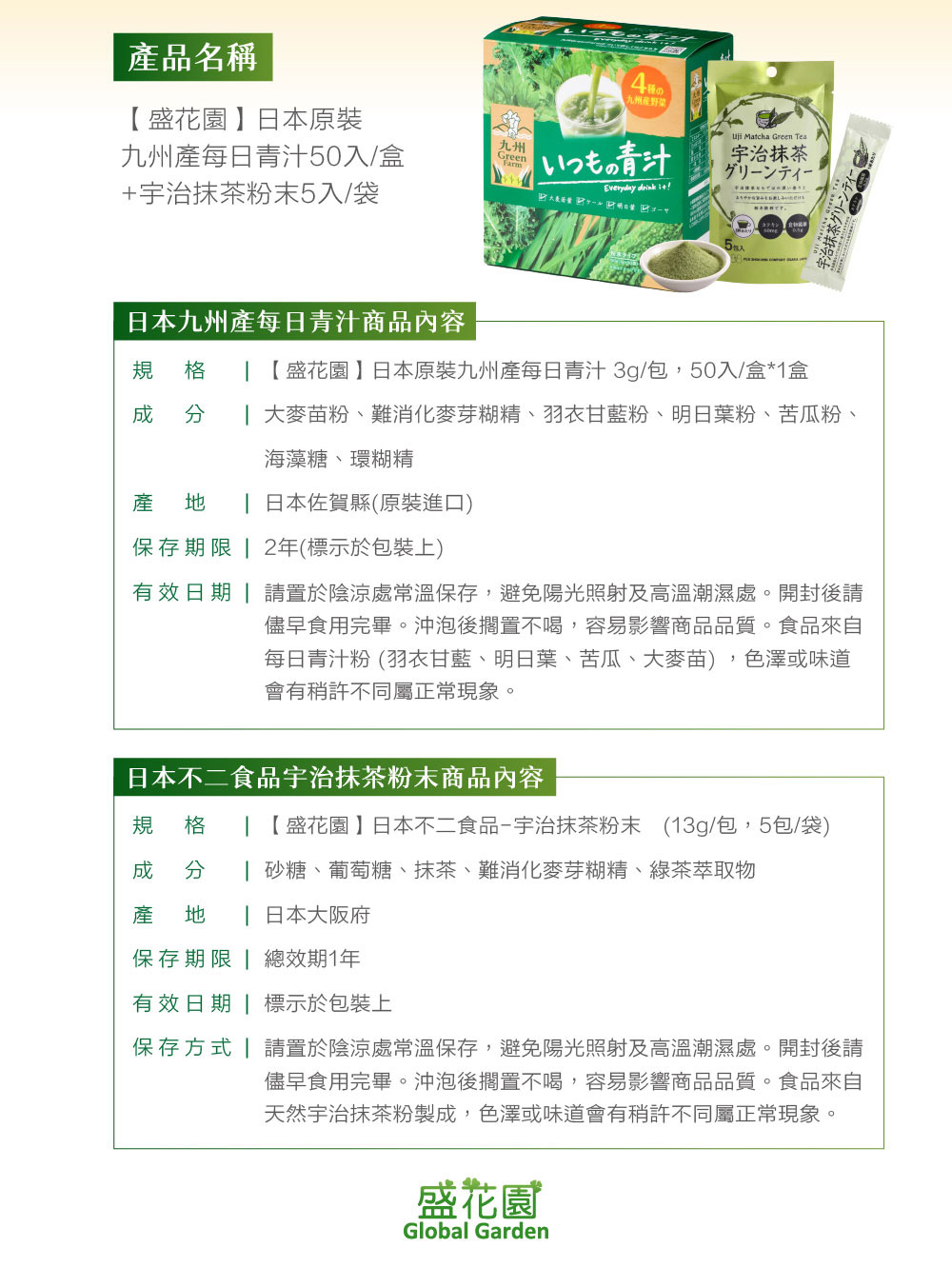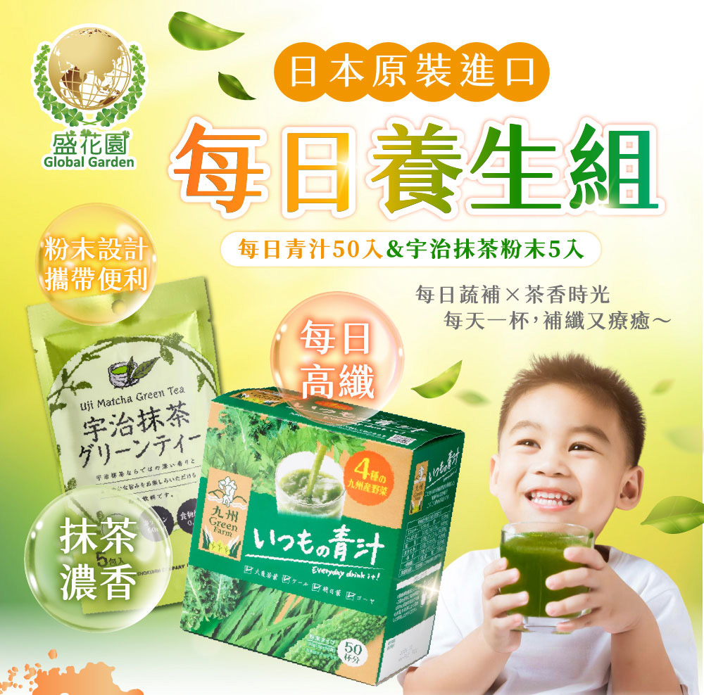 • 品名:【盛花園】日本原裝九州產每日青汁50入+宇治抹茶粉末5入養生組