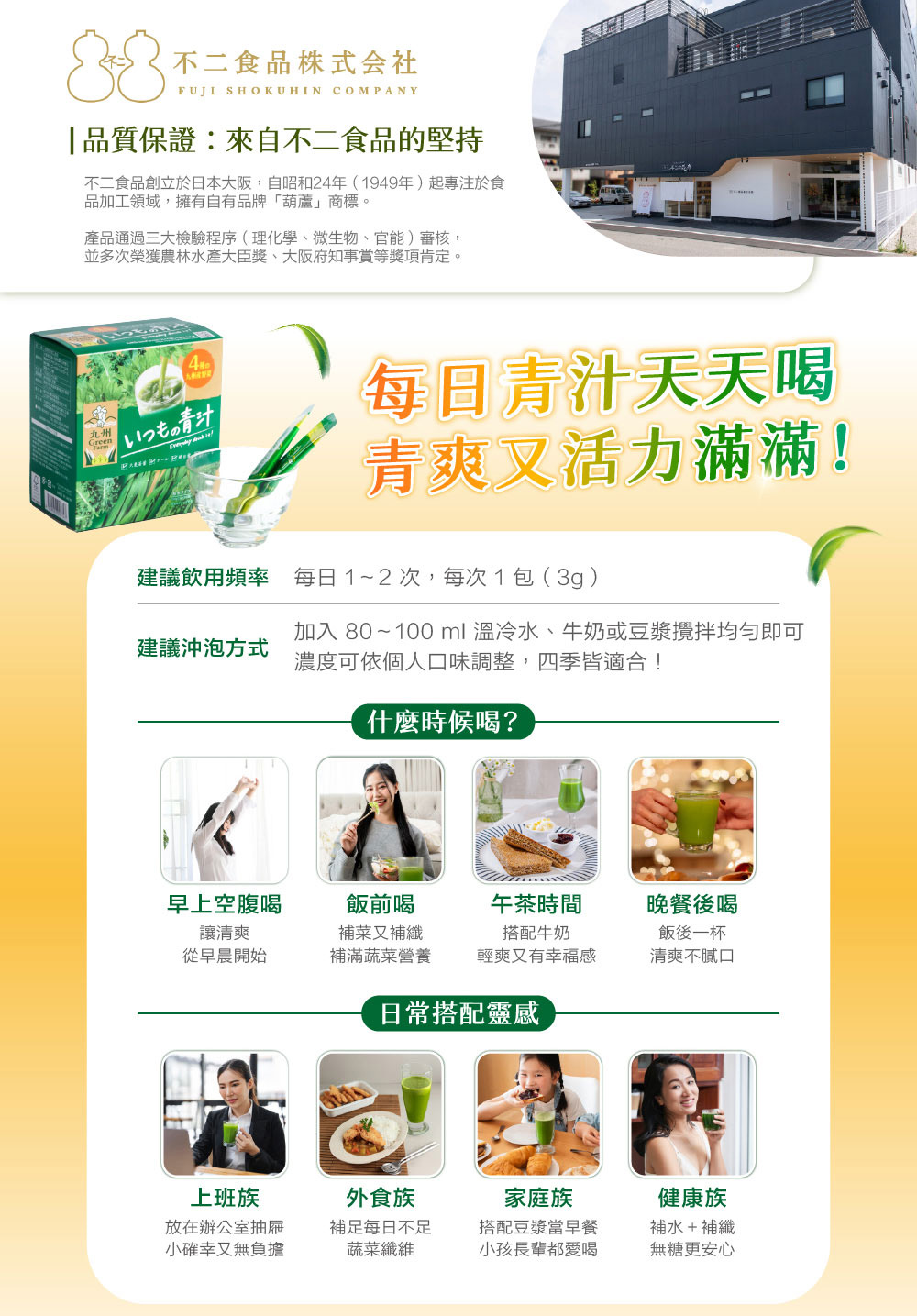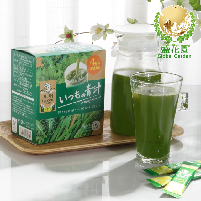 品質:選用九州地區契作栽培的大麥若葉、羽衣甘藍、明日葉、苦瓜等多種綠色蔬菜為主基礎,製成富含膳食纖維、每日補充蔬菜攝取的理想選擇。
