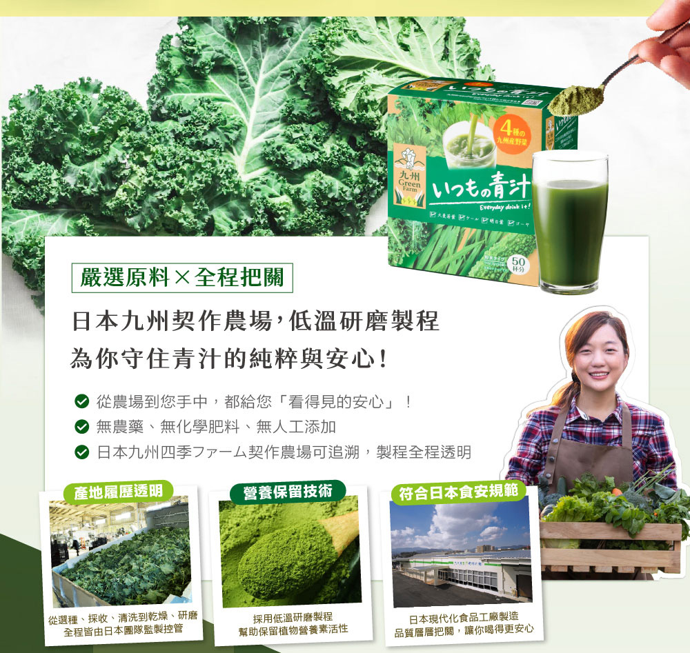「嚴選原料 × 全程把關」 日本九州契作農場,低溫研磨製程 為你守住青汁的純粹與安心!