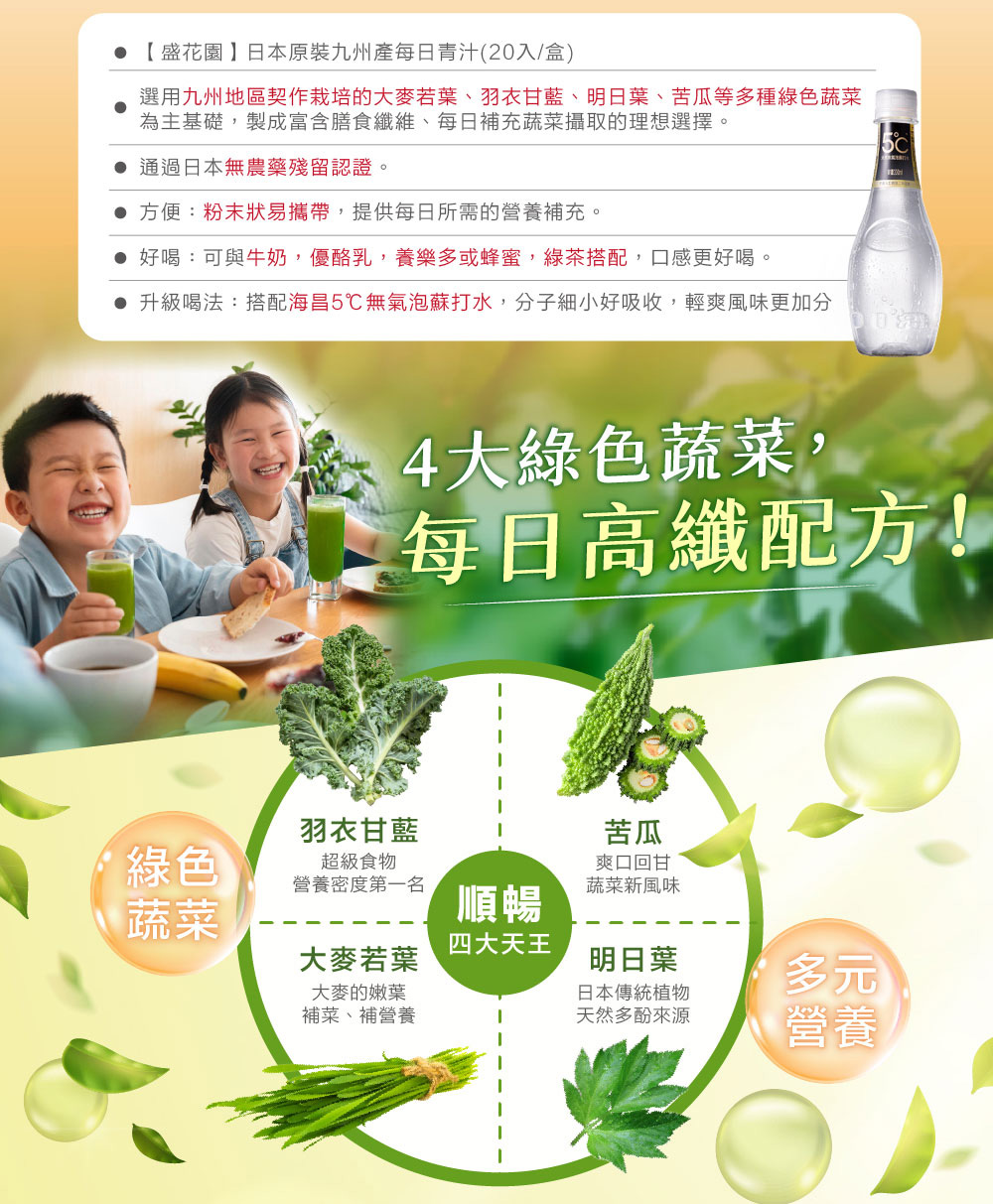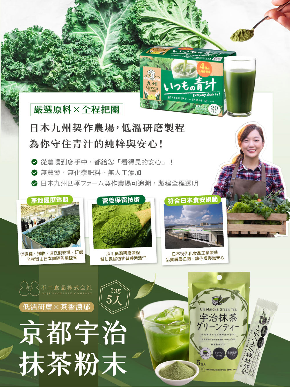 品質:選用九州地區契作栽培的大麥若葉、羽衣甘藍、明日葉、苦瓜等多種綠色蔬菜為主基礎,製成富含膳食纖維、每日補充蔬菜攝取的理想選擇。