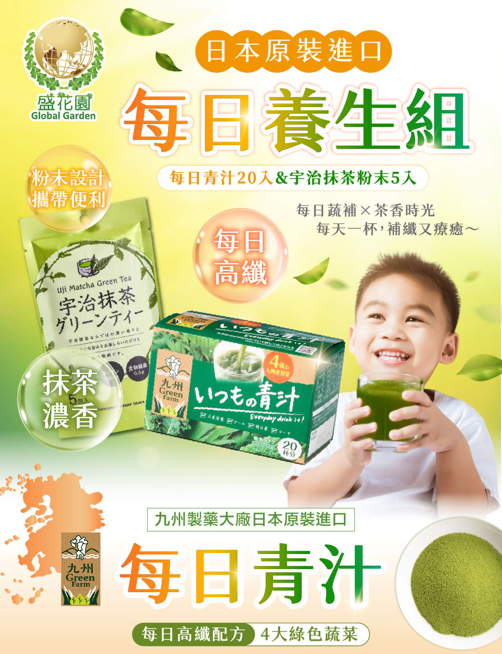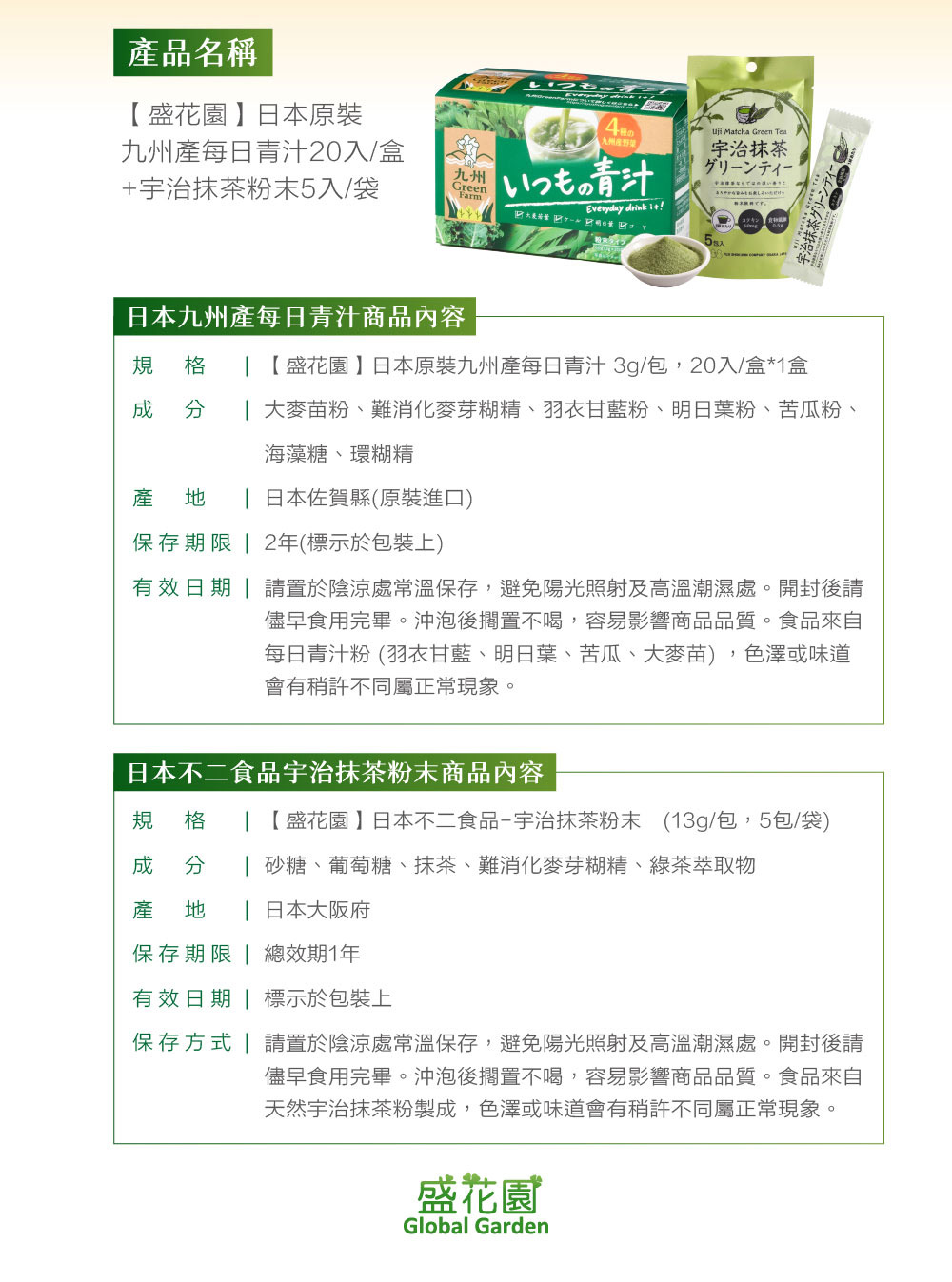 • 品名:【盛花園】日本原裝九州產每日青汁20入+宇治抹茶粉末5入養生組