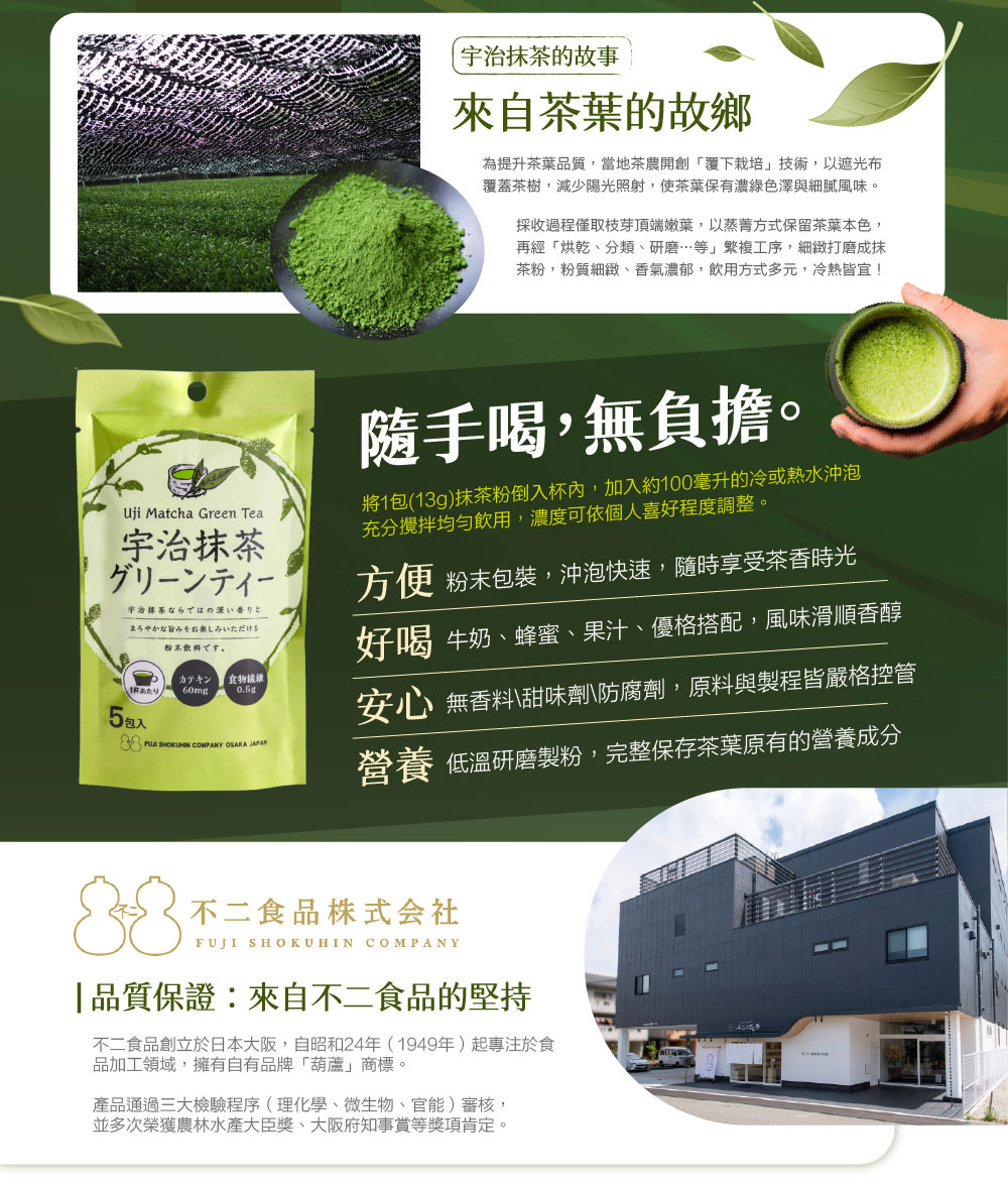 使用正宗宇治抹茶特別調製而成,微糖,讓對茶苦味敏感的人也能輕鬆飲用。一杯含 60 毫克兒茶素和 0.5 克膳食纖維,夏日炎炎加入冰塊一起飲用,冬日熱飲享受茶香,讓人不經意的續杯飲用,隨時隨地都能享受到味道濃郁的宇治抹茶香氣和醇厚的口感。