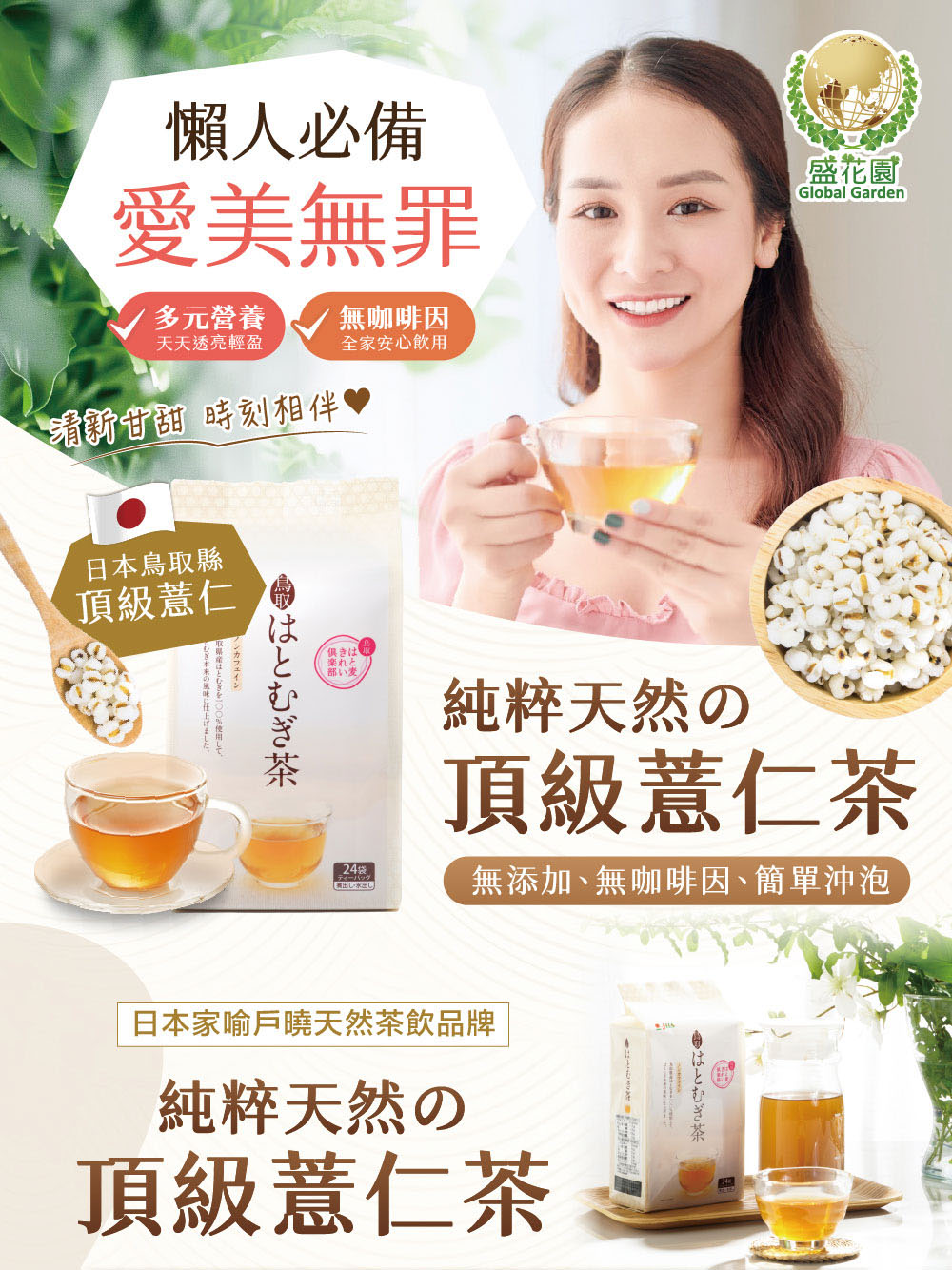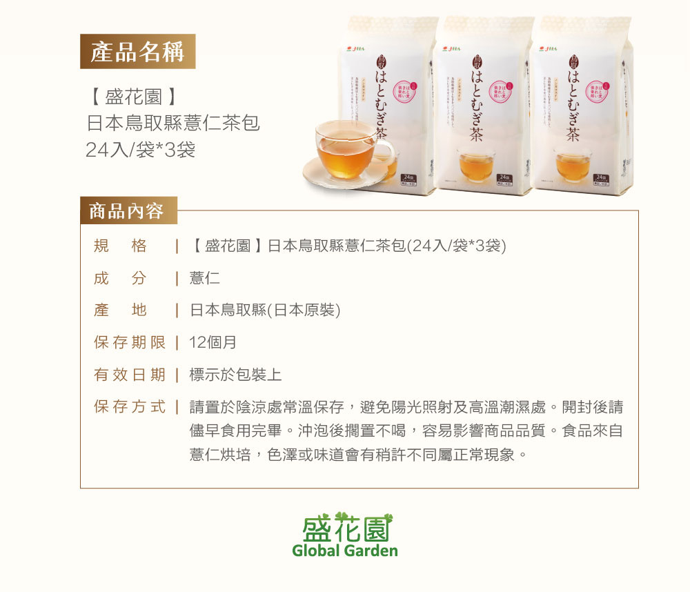 • 品名:【盛花園】日本鳥取縣薏仁茶包(24入/袋,3袋/組)