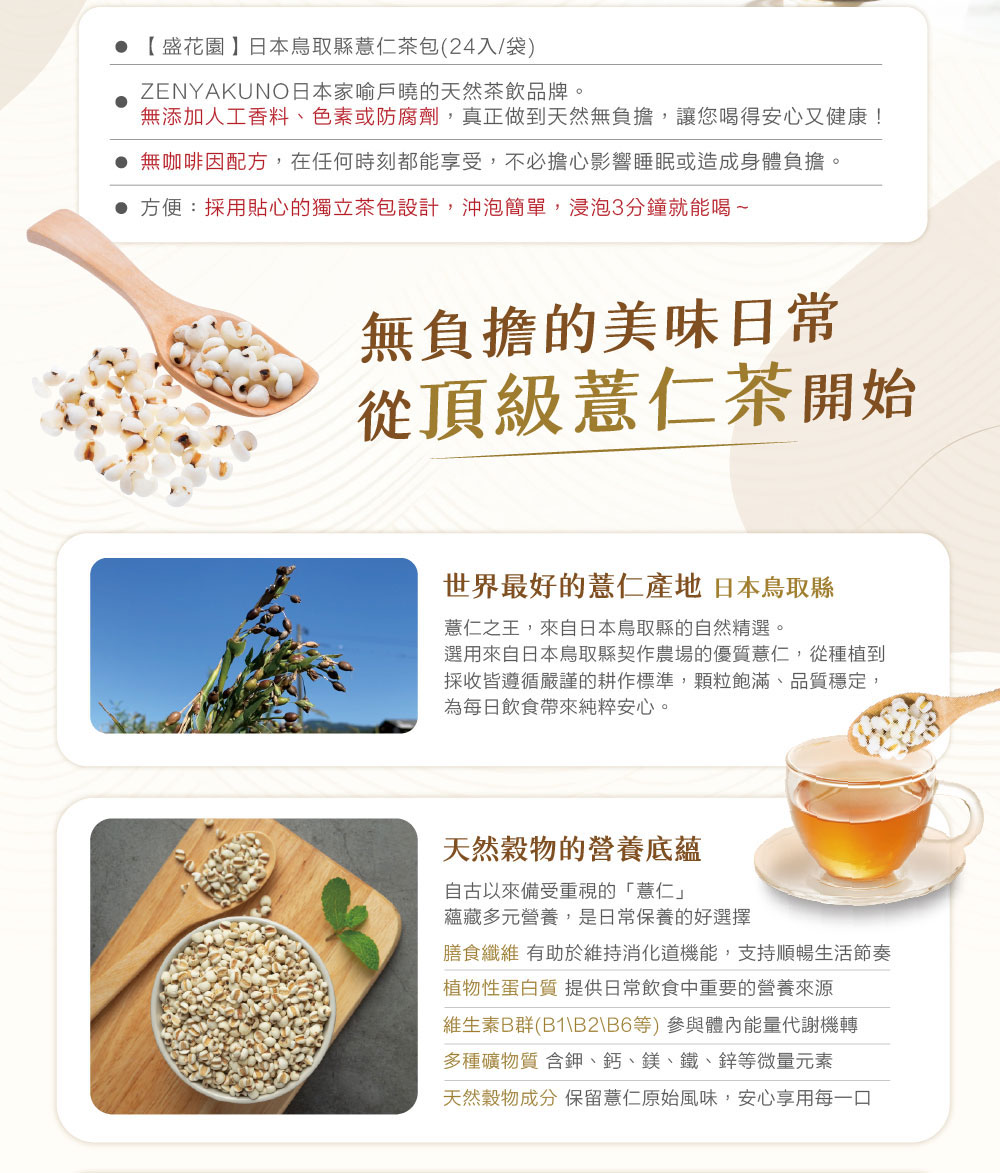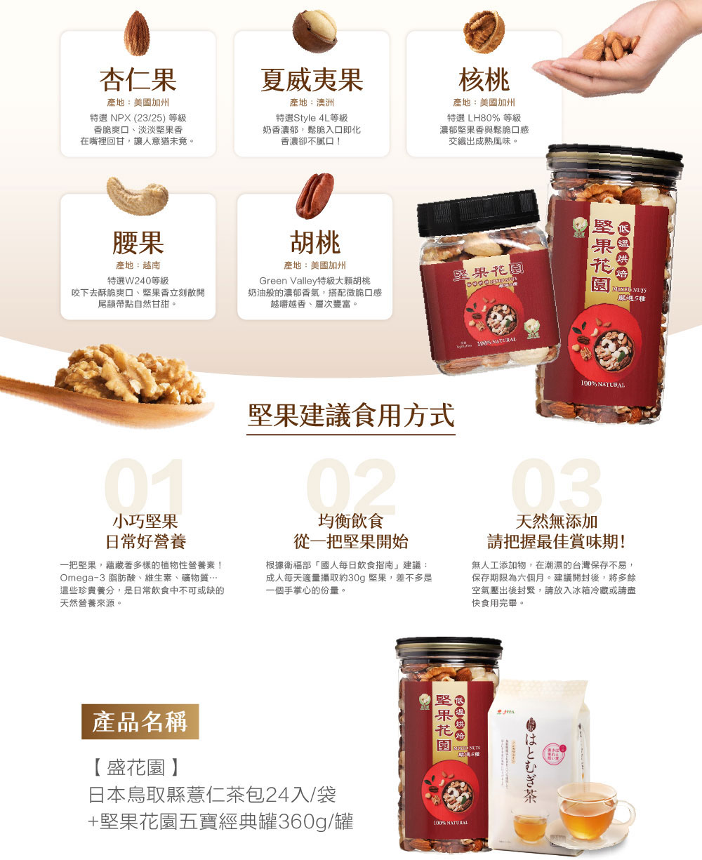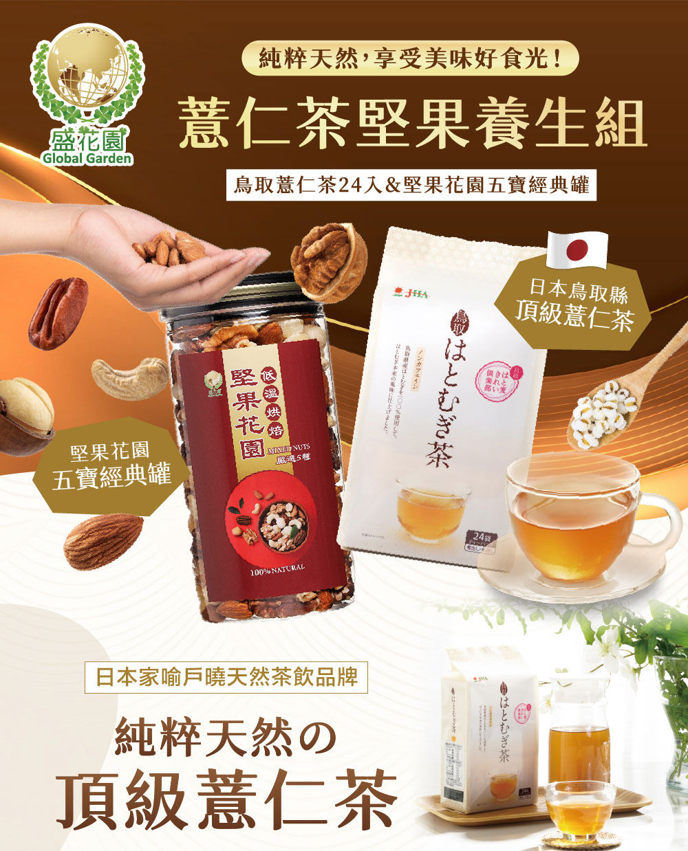 • 品名:【盛花園】日本鳥取縣薏仁茶包24入+堅果花園五寶經典罐1入雙享組