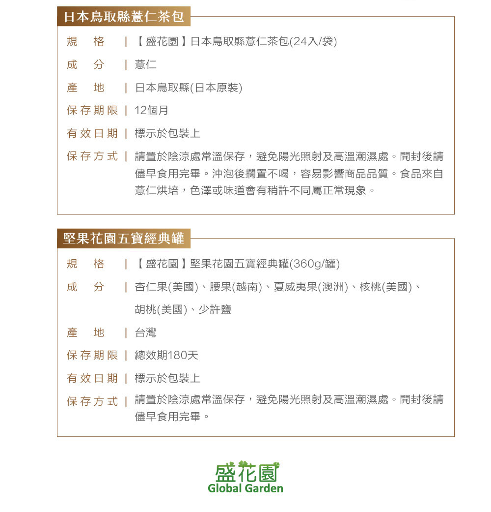 • 保存期限:薏仁茶包-12個月;堅果花園五寶經典罐總效期180天