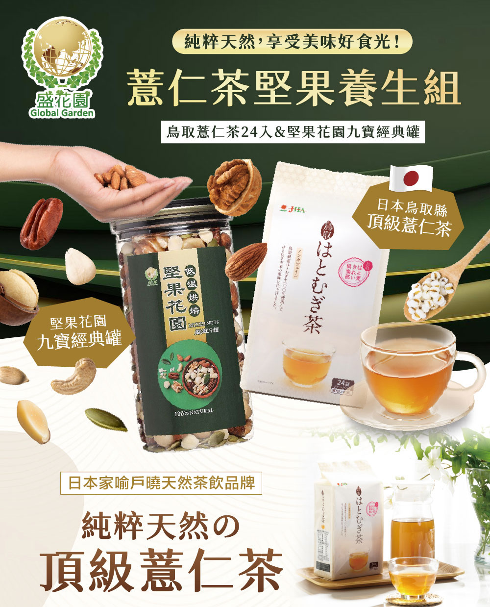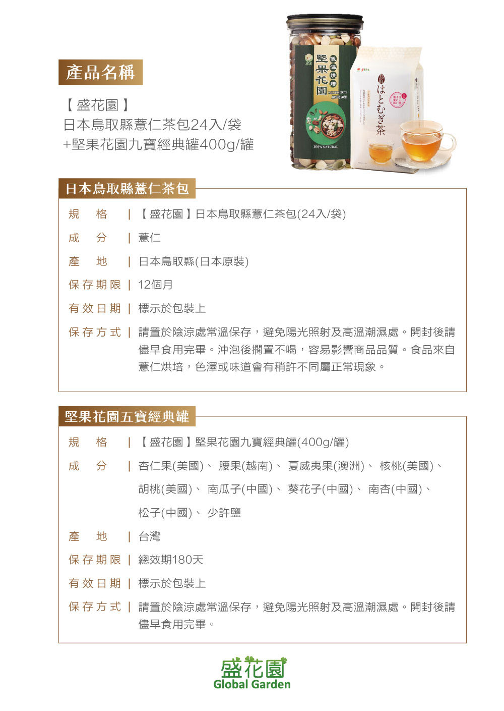 • 品名:【盛花園】日本鳥取縣薏仁茶包24入+堅果花園九寶經典罐1入雙享組