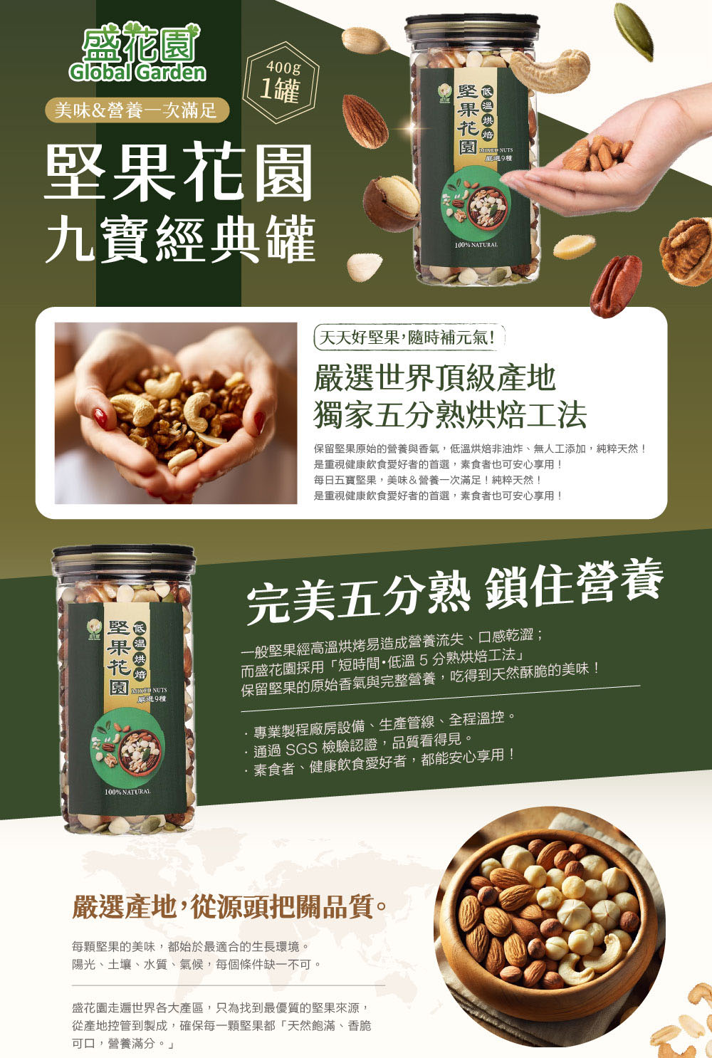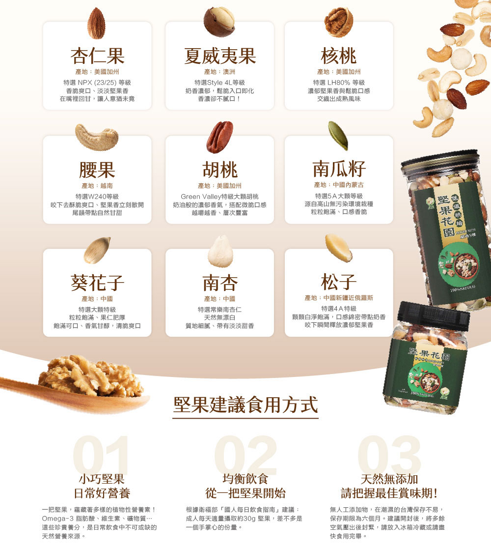 • 成分: 薏仁茶包-薏仁;堅果花園九寶經典罐-杏仁果(美國)、 腰果(越南)、 夏威夷果(澳洲)、 核桃(美國)、 胡桃(美國)、 南瓜子(中國)、 葵花子(中國)、 南杏(中國)、 松子(中國)、 少許鹽