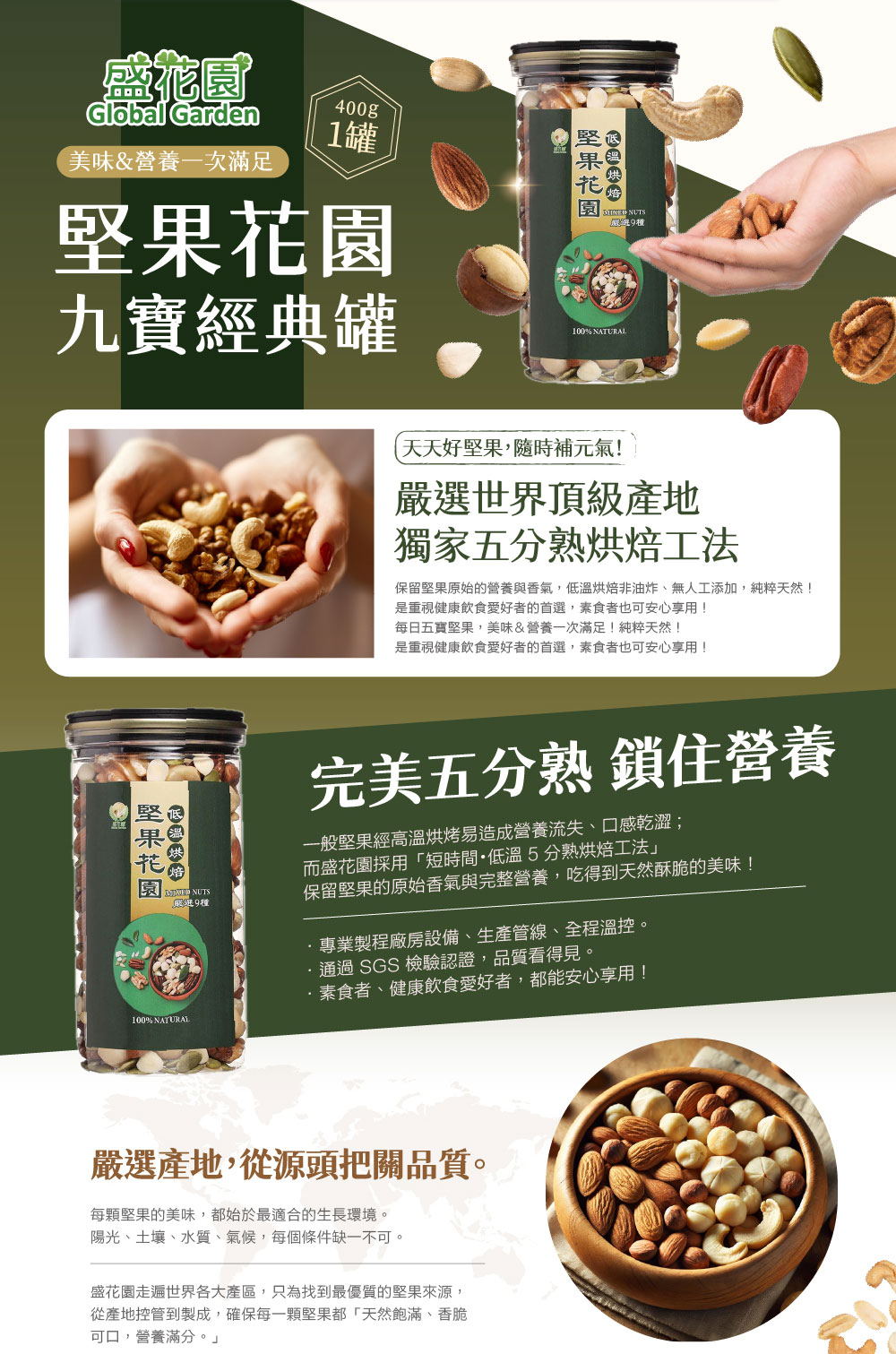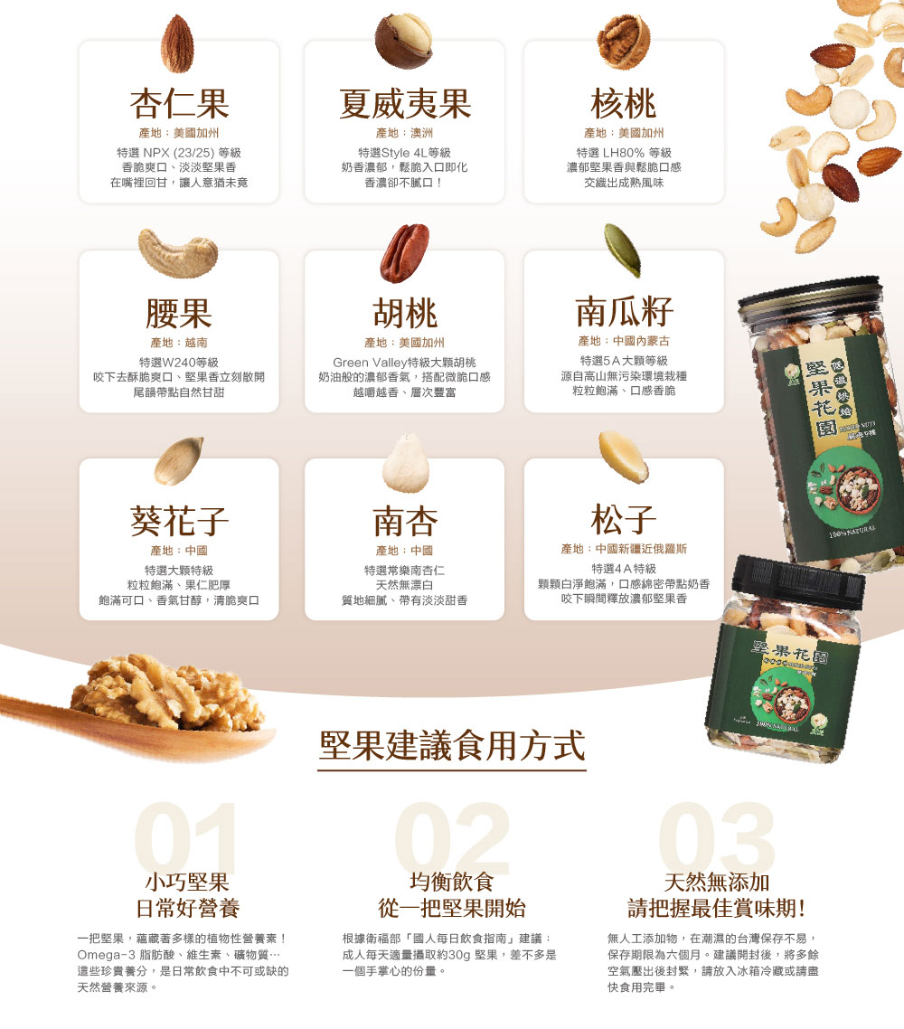 • 成分: 黑大豆茶包-黑大豆(本產品含大豆);堅果花園九寶經典罐-杏仁果(美國)、 腰果(越南)、 夏威夷果(澳洲)、 核桃(美國)、 胡桃(美國)、 南瓜子(中國)、 葵花子(中國)、 南杏(中國)、 松子(中國)、 少許鹽