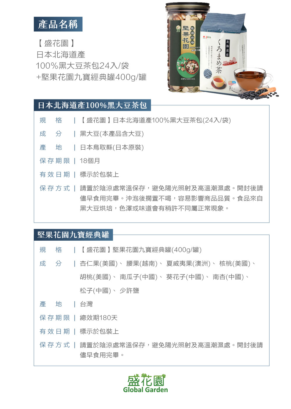 • 品名:【盛花園】日本北海道產100%黑大豆茶包24入+堅果花園九寶經典罐1入雙享組
