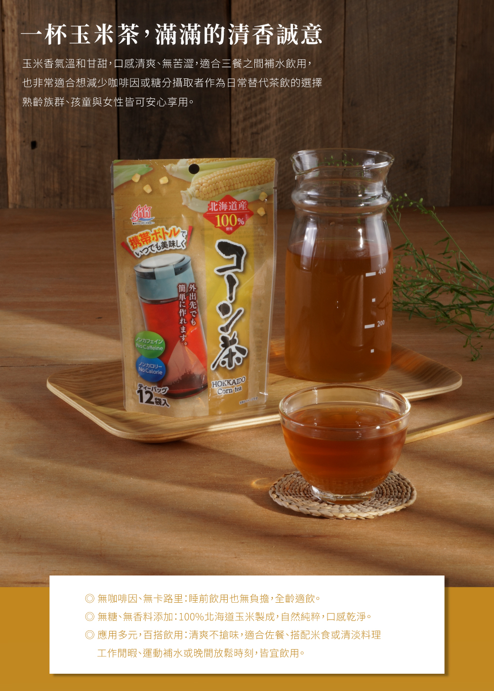 玉米香氣溫和甘甜,口感清爽、無苦澀,適合三餐之間補水飲用,也非常適合想減少咖啡因或糖分攝取者作為日常替代茶飲的選擇。熟齡族群、孩童與女性皆可安心享用。