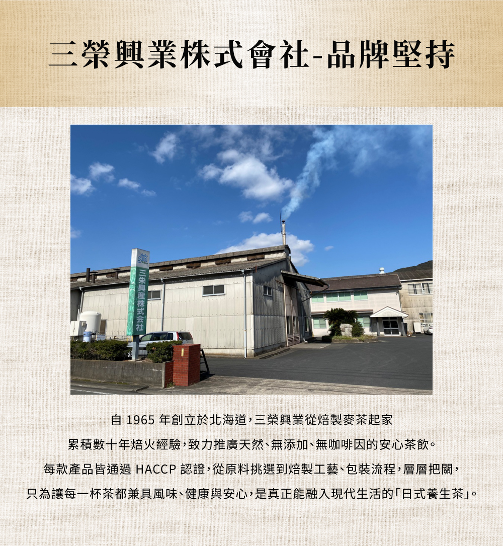 自 1965 年創立於北海道,三榮興業從焙製麥茶起家,累積數十年焙火經驗,致力推廣天然、無添加、無咖啡因的安心茶飲。每款產品皆通過 HACCP 認證,從原料挑選到焙製工藝、包裝流程,層層把關,只為讓每一杯茶都兼具風味、健康與安心,是真正能融入現代生活的「日式養生茶」。