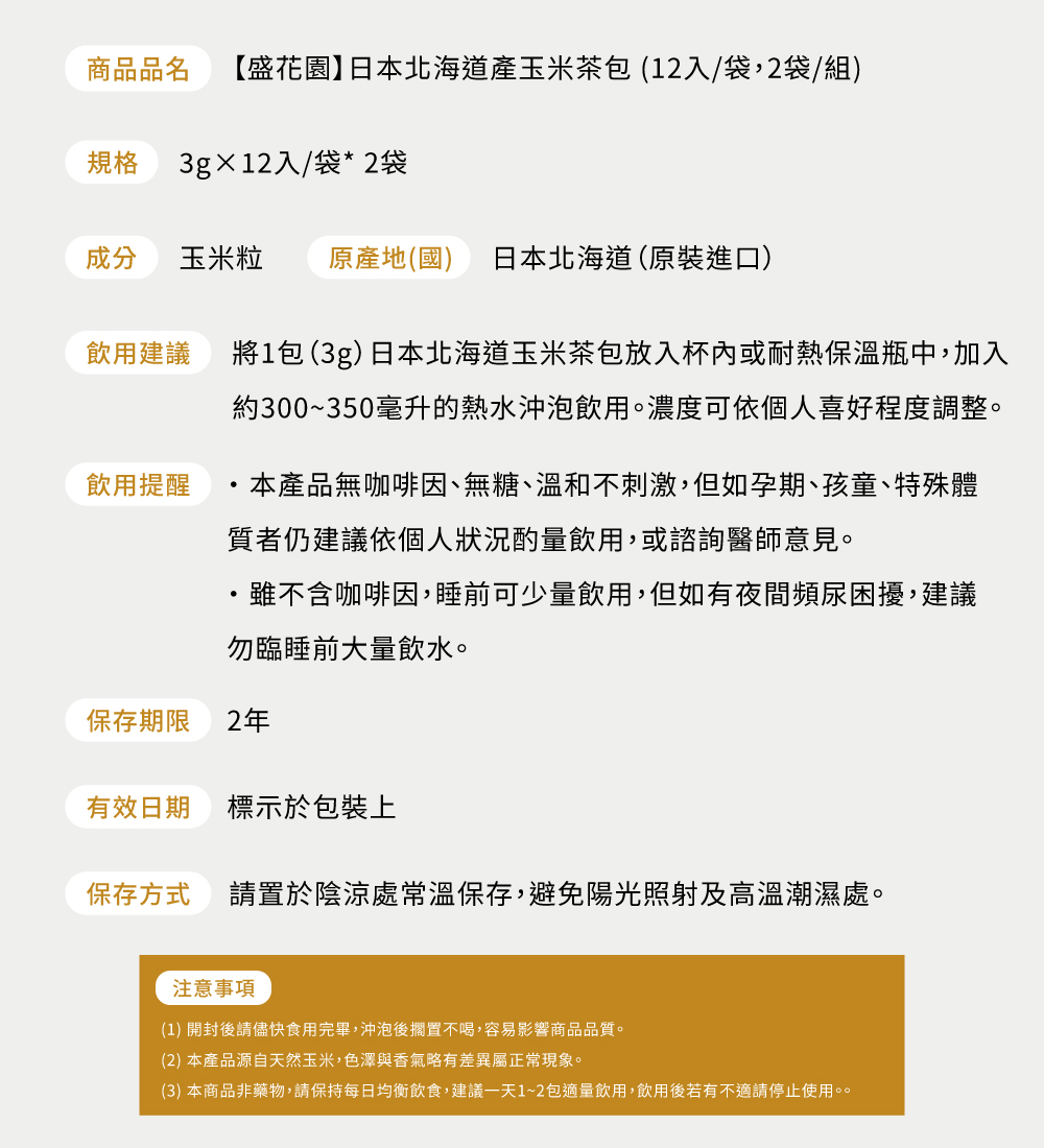 • 品名:【盛花園】日本北海道産玉米茶包 (12入/袋,2袋/組)