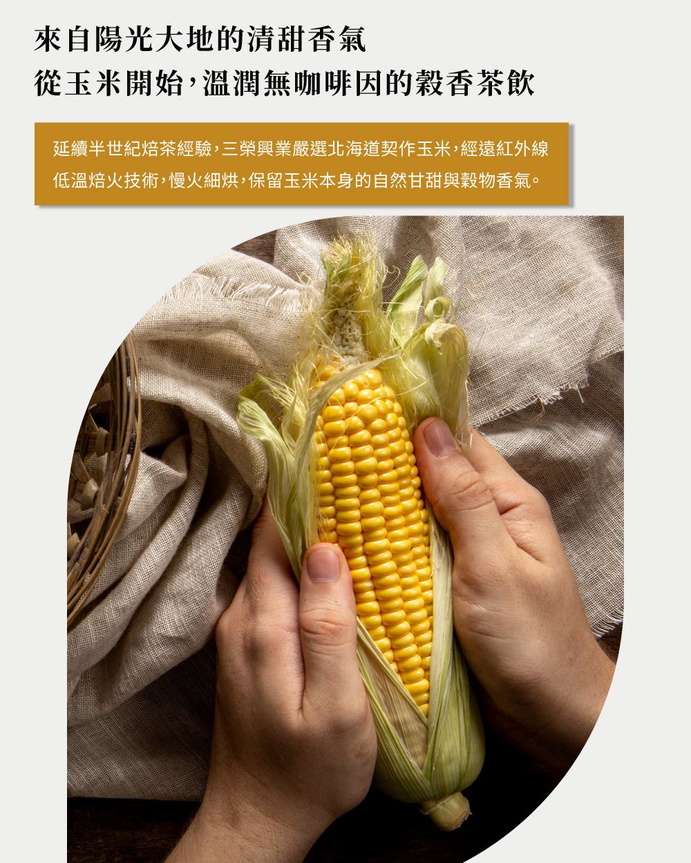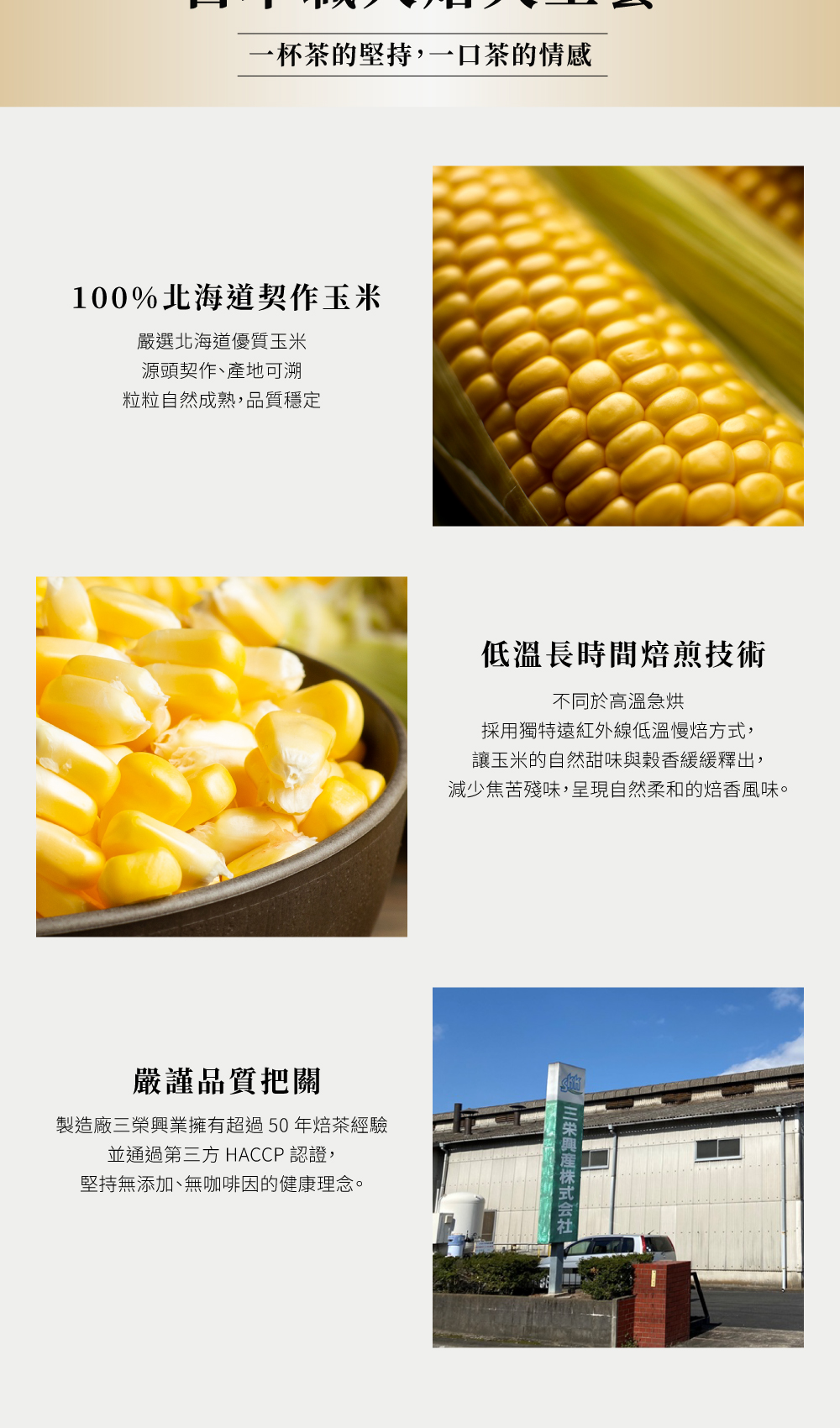延續半世紀焙茶經驗,三榮興業嚴選北海道契作玉米,經遠紅外線低溫焙火技術,慢火細烘,保留玉米本身的自然甘甜與穀物香氣,沖泡後茶湯淡黃透亮,入口柔和滑順,回甘悠長,是日常補水、飯後解膩的最佳選擇。無咖啡因、無糖、無香料,全齡皆宜。