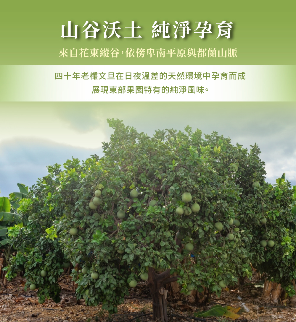 來自花東縱谷,依傍卑南平原與都蘭山脈。四十年老欉文旦在日夜溫差的天然環境中孕育而成,展現東部果園特有的純淨風味。