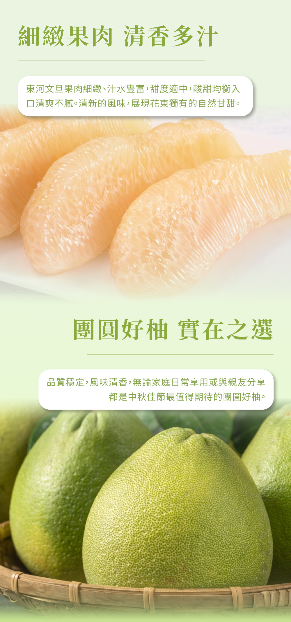 東河文旦果肉細緻、汁水豐富,甜度適中,酸甜均衡、入口清爽不膩。清新的風味,展現花東獨有的自然甘甜。