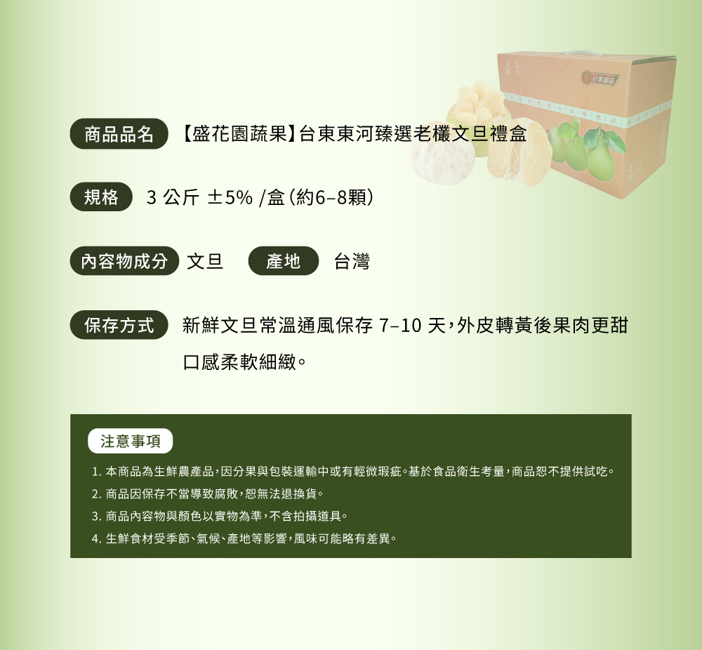 • 品名:【盛花園蔬果】台東東河臻選老欉文旦禮盒(3公斤/盒)