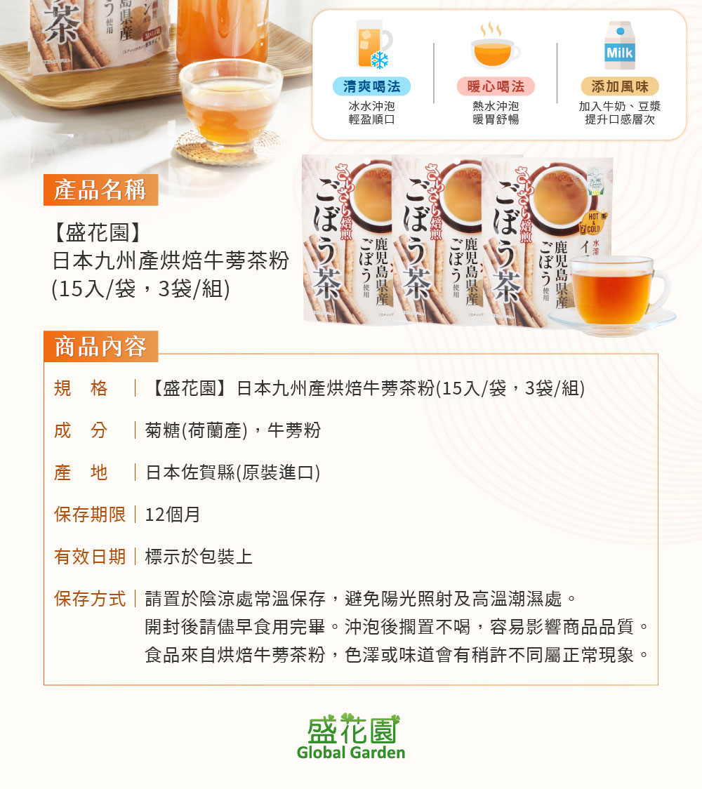 • 品名:【盛花園】日本九州產烘焙牛蒡茶粉(15入/袋,3袋/組)